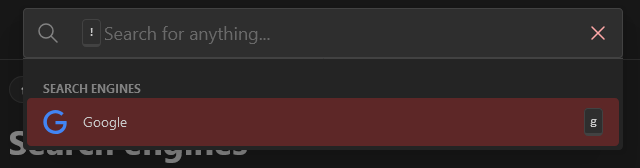 Prefix that is used to choose the search engine in the popover using the keyboard. It is recommended that this value is kept short (for example g for Google and e for Ecosia).